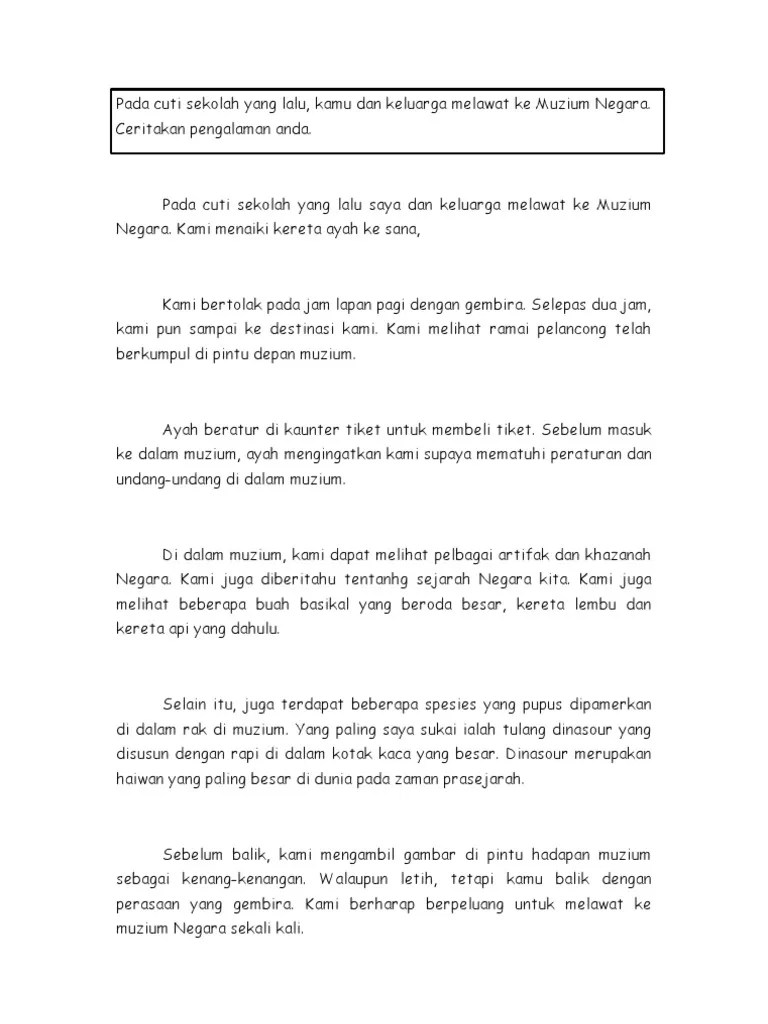 Karangan bertajuk 'lawatan ke zoo negara'. Pada masa cuti sekolah yang lalu, sekolah saya telah mengadakan suatu lawatan sambil belajar . Kami berasa gembira kerana telah memperoleh banyak . Lawatan sambil belajar ke kilang contoh karangan laporan lawatan ke. Program pendidikan luar bilik darjah (plbd) iaitu lawatan ke zoo negara
